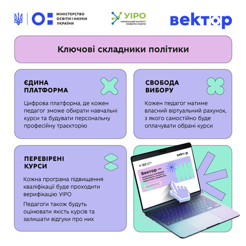 «Вектор»  — національна платформа професійного розвитку педагогічних працівників. Це демоверсія майбутньої національної платформи професійного розвитку педагогічних працівників, яку створюють МОН України та УІРО: https://vector.uied.gov.ua
